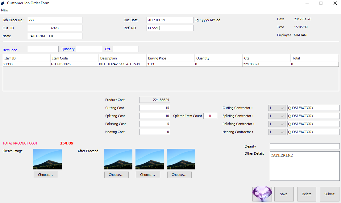 Job Order Form will notify the Stock Status after deducing the Gems sent for the Contractors for Cutting, Splitting, Polishing and Heating purposes.